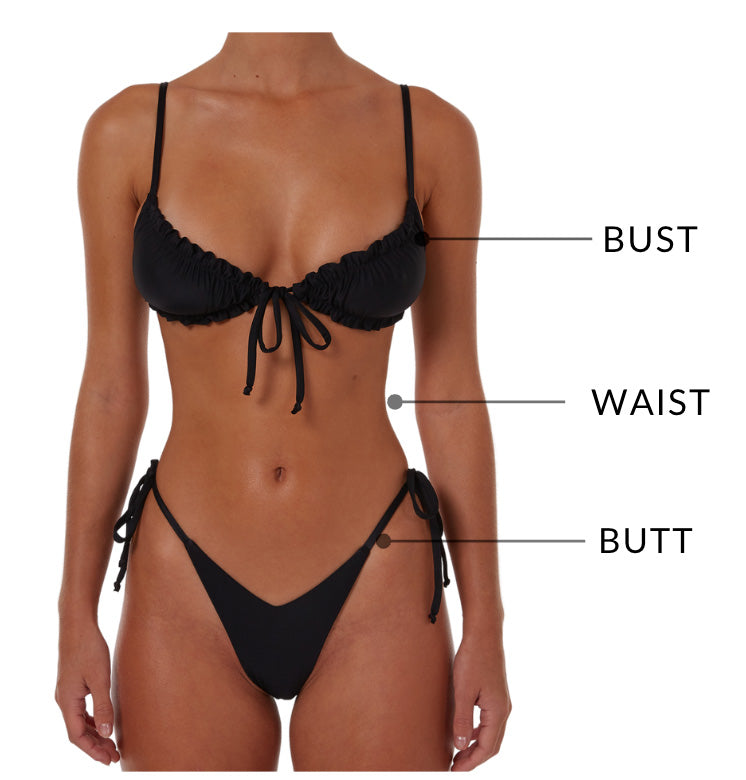 • No two orders placed will ever be identical in size (we allow a discrepancy of 0.5mm) as every bikini is hand crafted and passes through a production team of different cutters sewers each time.