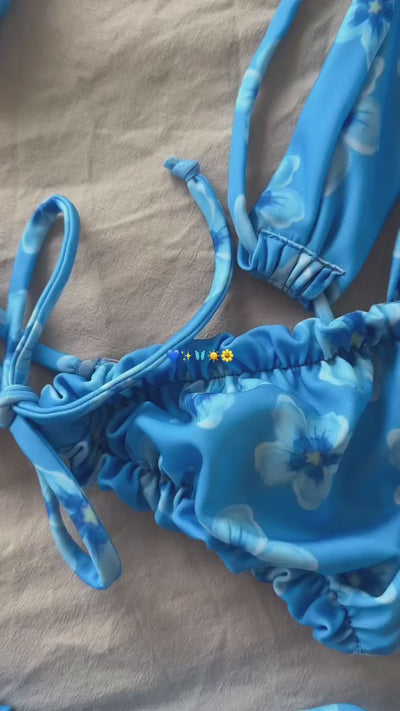 Meet the cutest best seller - orchid blooms wide ruched string set. This is the bikini you will be reaching for this season. Featuring dainty, soft blue flowers on a blue base, this colour is suited to all skin shades! The wide ruched string set is the perfect cut designed to suit women of all body types, especially those with largest busts needing extra support. The wider straps on this top paired with the wide string bottoms provide maximum support and comfort for a flattering figure.